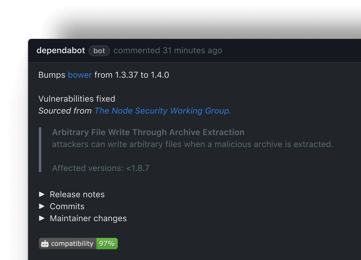 Dependabot makes it easy to find and fix vulnerable dependencies in your supply chain.