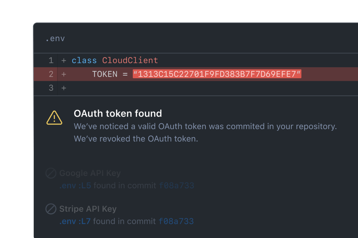 Secret scanning automatically looks for partner patterns and prevents fraudulent use of accidentally committed secrets.